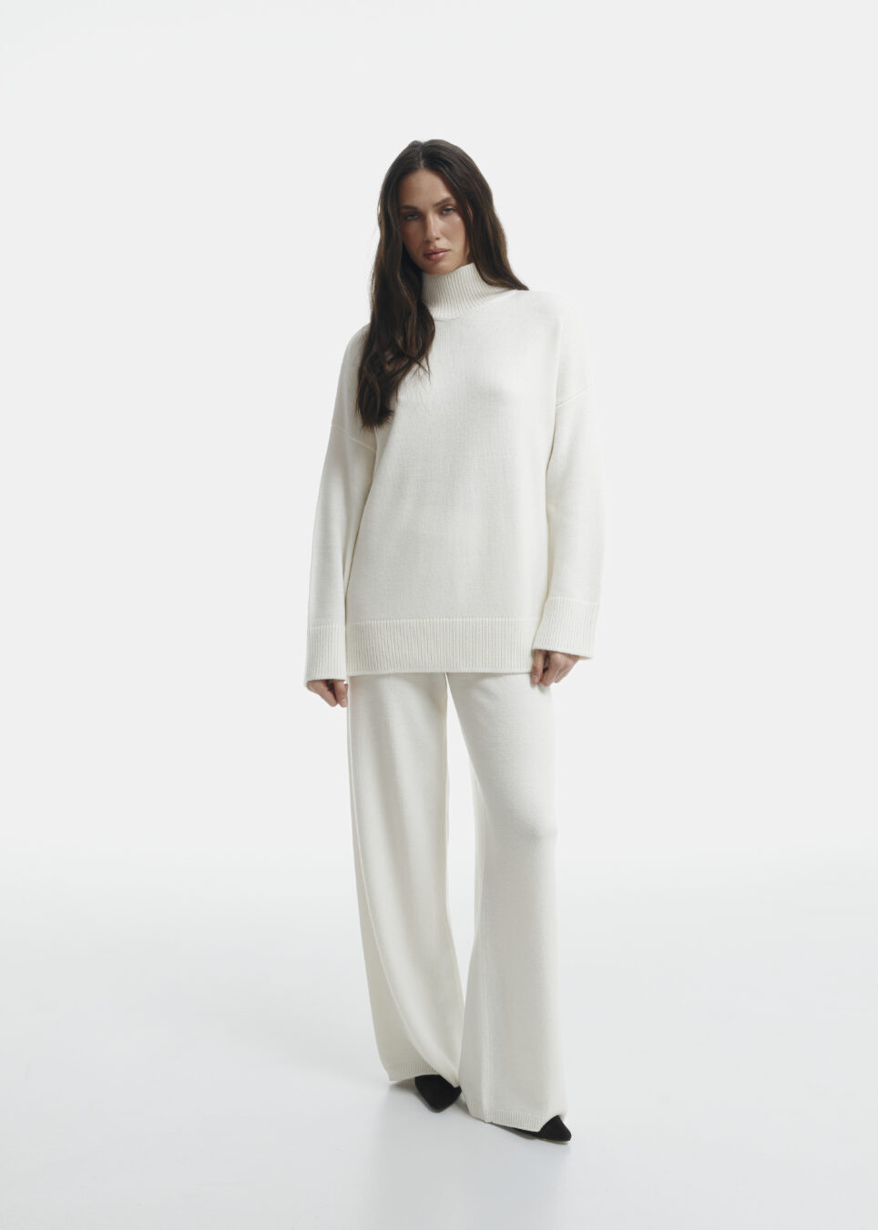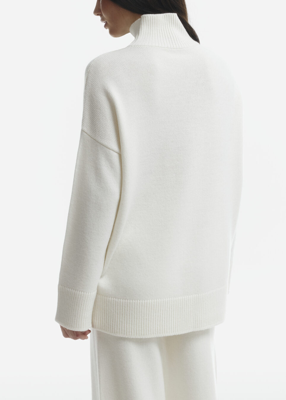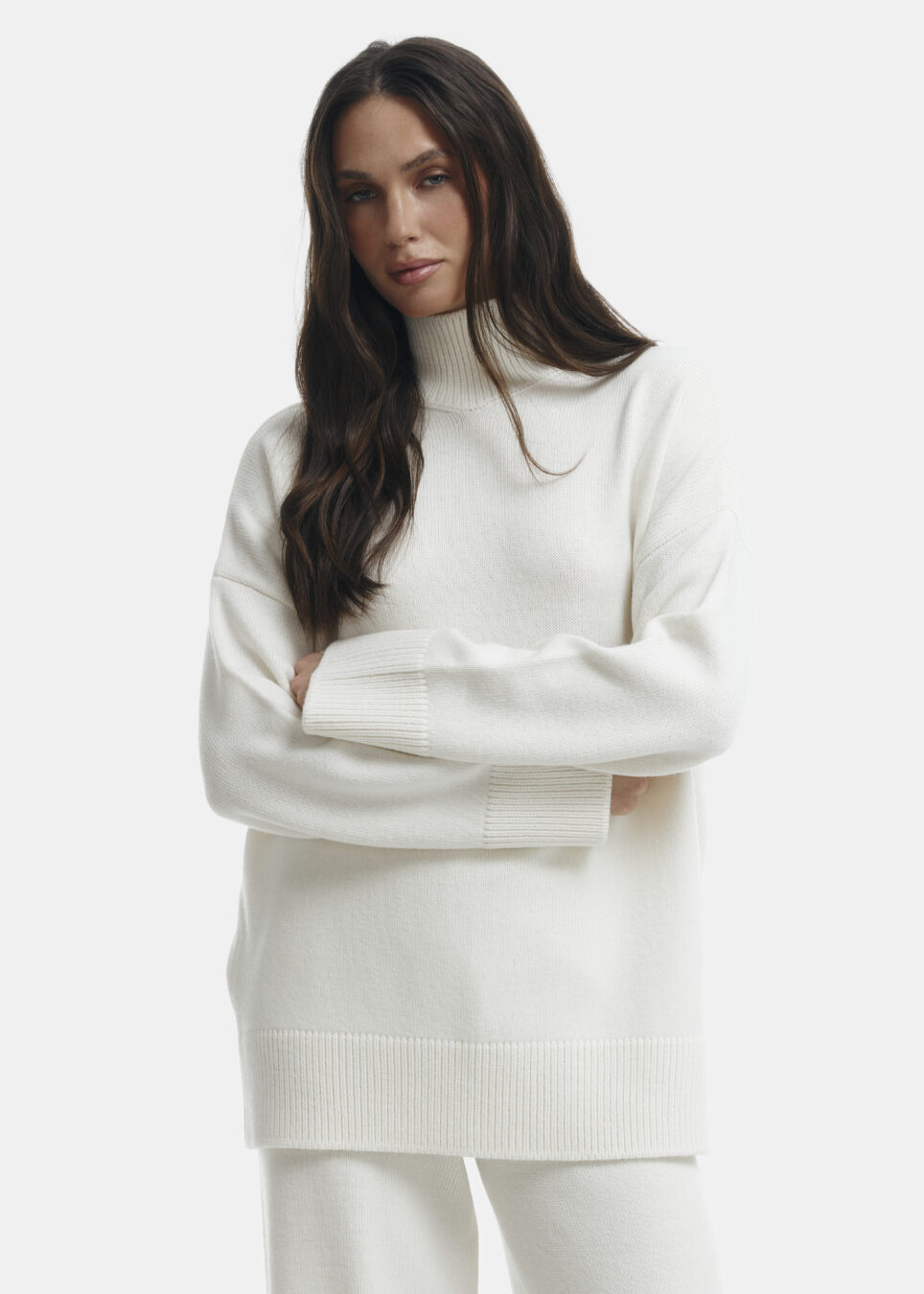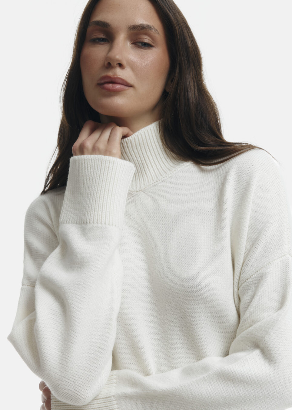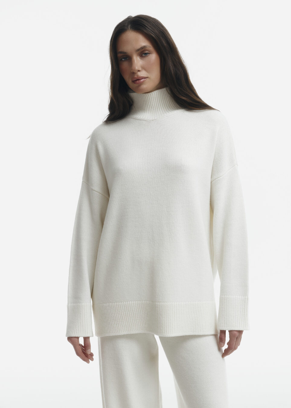 Amanda long sweater in milky color. A warm sweater made of merino wool in a loose cut with a high, cozy neckline. A great option for the cool season.