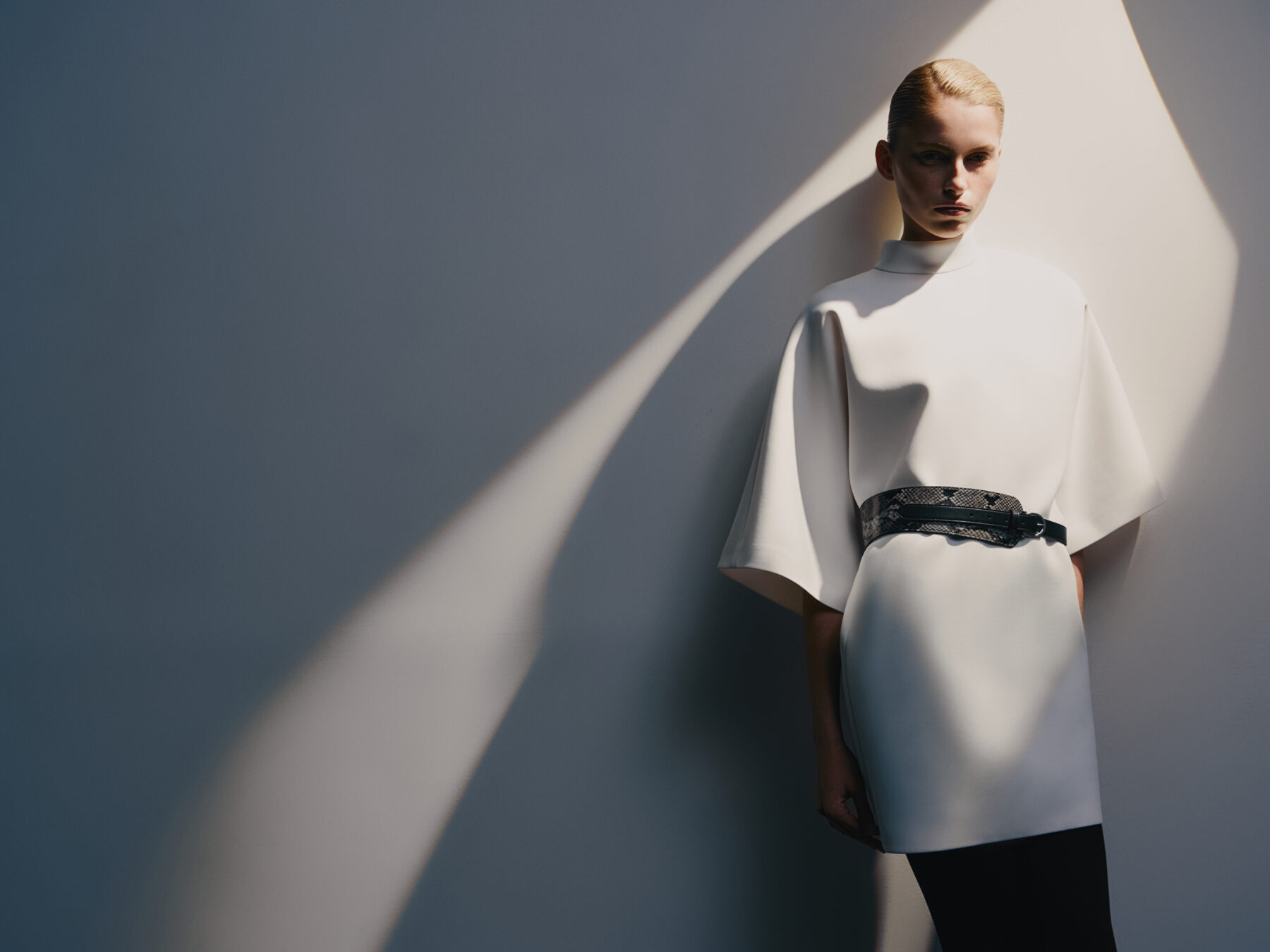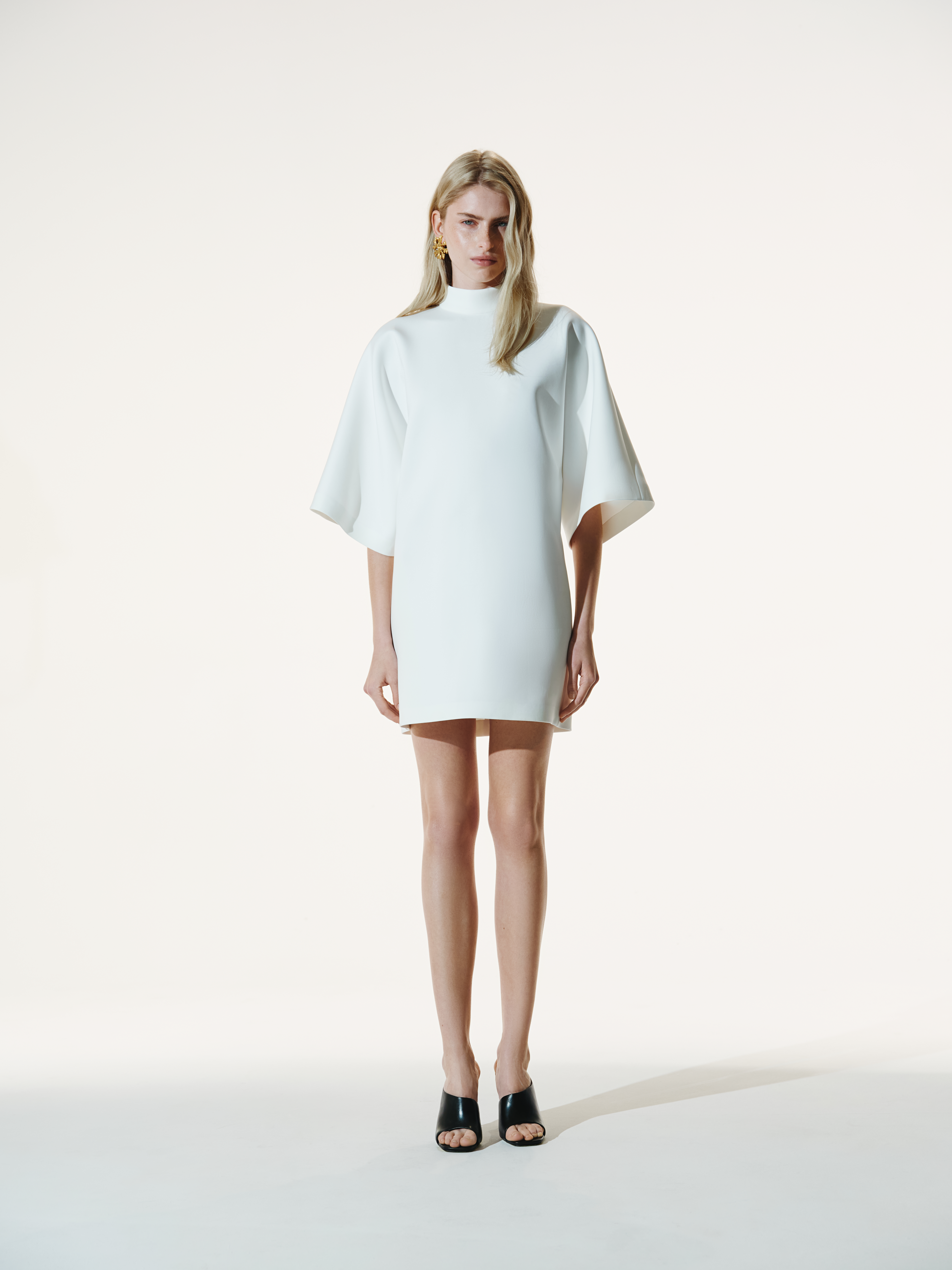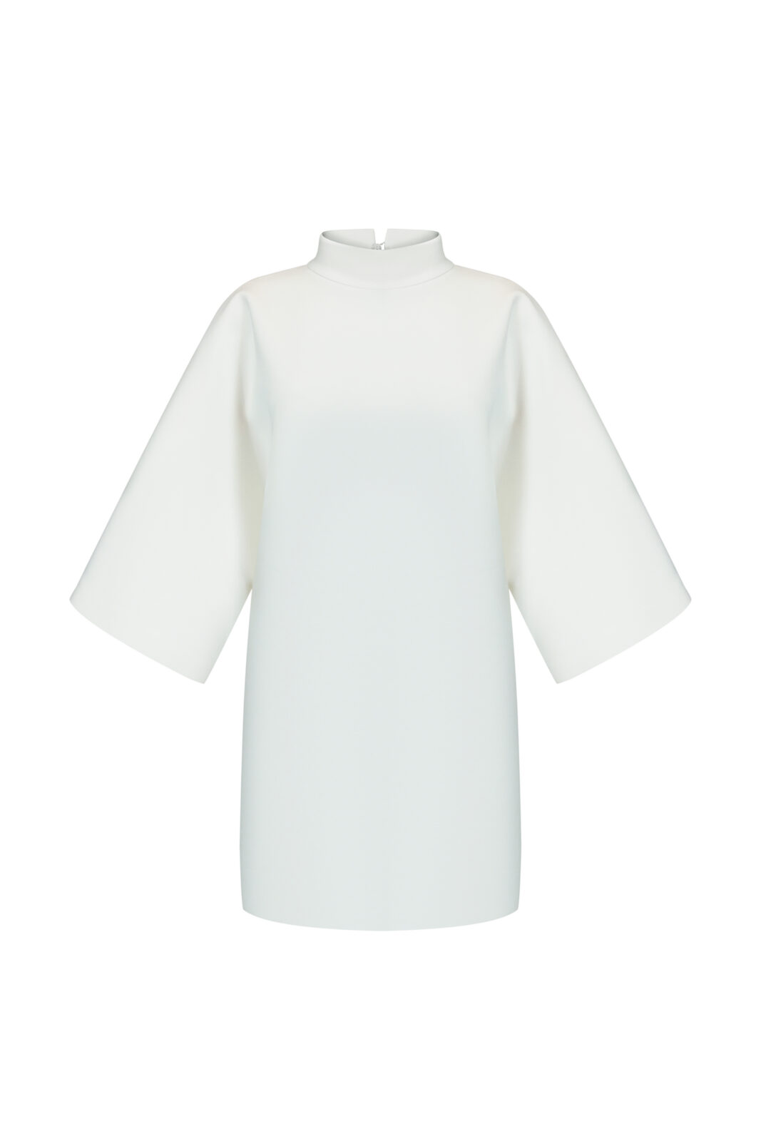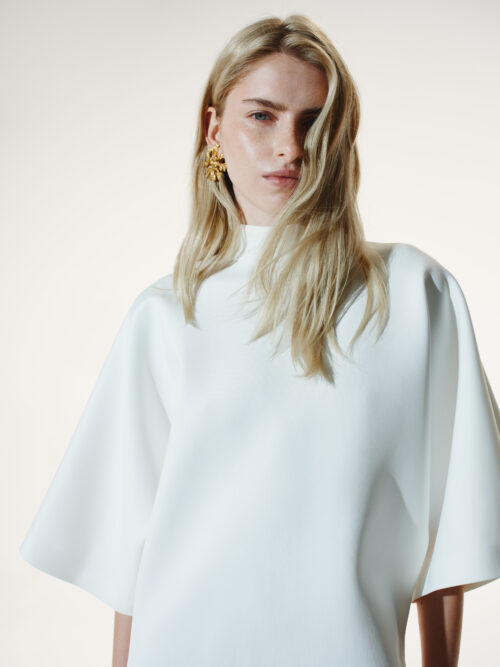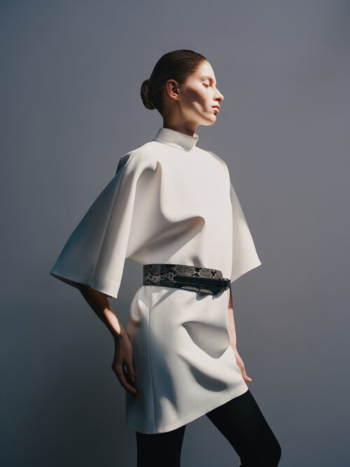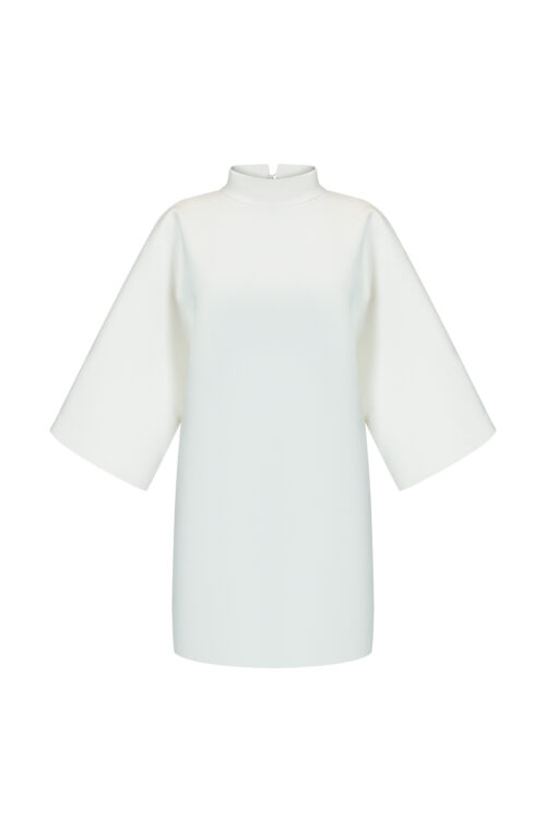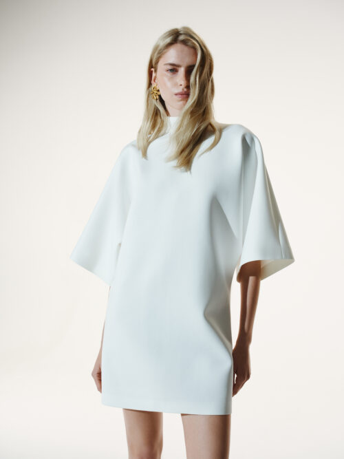 This dress is like a white silence that speaks louder than words. The scuba creates an architectural form: it holds volume, does not wrinkle, and remains light on the body. Wide sleeves, a high neckline, and a clear silhouette are like armor made of elegance.